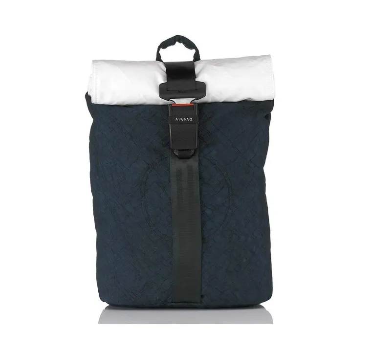 車のエアバッグとシートベルトの廃材をアップサイクルして作られたバックパック。廃材を再利用するため、製品一つ一つがオリジナル、全てが一点物です。アップサイクル商品ならではの風合いとユニークなデザインが特徴的です。本物のシートベルトのバックルを再利用している、この世で唯一とも言えるバッグになっています。