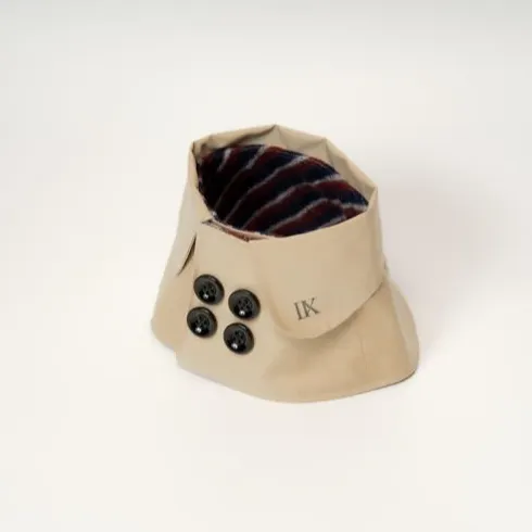 上質でクラシカルなデザインのトレンチ風ケープ。 まるでトレンチコートを着たかのような上品な雰囲気を演出します。 シックなベージュとグレーのカラーの2色展開。 裏地にもワンポイントととして、柔らかい生地のボーダー柄を使用。 ボタンや襟のディテールまでこだわり抜いたデザインで、フォーマルな場面にもぴったりです。 マジックテープなので着脱も簡単にでき、快適におしゃれを楽しめます。 シンプルでありながら洗練されたデザインは、日常使いはもちろん、特別な日のコーディネートにも最適です。