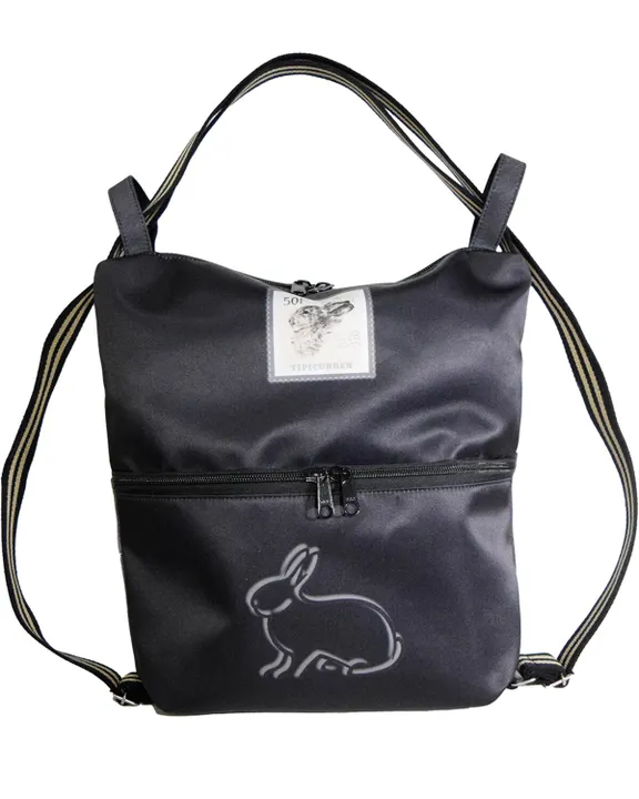 ティピィカレン ワンショルダーリュック2WAYバッグです。 表は光沢のあるブラックに一筆描きと切手のラビットのモチーフ、裏面は革のようなスクエアパッチワークベースにHAPPYとラビットをモチーフにデザインしています。 Hoboバッグ風にワンショルダースタイルとリュックスタイルに使い分けて楽しく使ってください。 A4サイズの入る機能的なバッグです。大きな外付きファスナーポケットは収納力もあります。開口部もポケット部分もダブルファスナーで使いやすい仕様になっています。 ポリエステル素材で、光沢感あり、発色がよく、高級感のある素材感が魅力です。 タペストリーやカーテンなどのインテリアファブリックで、生地の厚みや硬さ、強度などが高くバッグとして扱いに適している素材です。撥水ではありませんが水にも強いです。 裏地はコットンで切ポケットを1個つけています。全体の重さは300gでとても軽いバッグです。 素材やパーツなどもこだわり、プリント、縫製もこだわりながら、日本製で丁寧な仕上がりです。 両面の印象が変わるようプリントを変えて、どちらの面を気分で使い分けしたくなる楽しさがティピィカレンバッグの特徴でもあります。 ファブリックバッグの良さを追求し、オリジナルテープを使い、個性的で、高級感もあり、実用的なバッグとして是非お試しください。