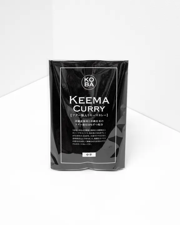旨味の異なる2種類の豚肉と15種類以上のハーブやスパイス、あめ色になるまでしっかりと炒めた玉ねぎを、大量のトマトとともに長時間煮込んで作りました。複雑なスパイスの香りを引き出して凝縮させたKOBAオリジナルのキーマカレーです。 2017年那覇カレーグランプリ優勝した際のレシピを再現し、増粘剤やアミノ酸など不使用で素材にこだわった商品です。 地域の特産品にも推奨され、付属の追いスパイスは辛みスパイスとハーブをブランドしており、お好みで追加していただくことでスパイスをより感じるカレーとなります。