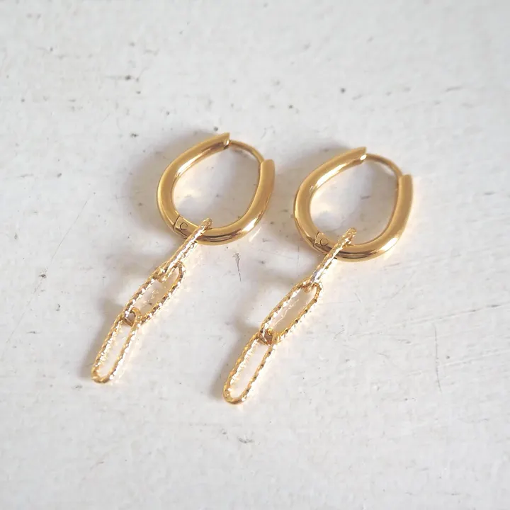 ピアス【Circle】ステンレスワンタッチフープ+太チェーン2wayピアス 活躍度の高いシンプルなデザイン×機能性 低アレルギーのステンレス素材を2wayでたのしめる 新たなピアスコレクション 低アレルギー素材として人気の高いステンレス素材のピアスが登場! 安心感ある淡水パールやチェーンのゆれ感、テクスチャーの輝きを織り交ぜて 日常の様々なシーンで活躍する万能で汎用性の高いデザインに シンプルなフォルムに着け外し可能なチャームをプラスした Oucaらしさをまとう新たなコレクションです ◆ POINT ◆ ・程よいボリュームのフープピアスに、取り外し可能なチェーンのチャームをプラスしたデザイン。 ・フープピアス本体、チェーン部分は全てゴールドカラーのメッキを施したステンレス素材。メッキはIPメッキ(イオンプレーティング)と呼ばれる密着性と耐久性に優れたコーティング加工を採用。 ・艶やかでなめらかなフープピアスは長さは17mmほどと耳元に上品に収まるサイズ。フープとポスト部分が一体化したワンタッチタイプは着用もスムーズで、わずかに縦長の緩やかなしずく型を描くニュアンスあるフォルムが魅力的。 ・チャームは大きなコマのデザインチェーンをチョイス。幅のあるチェーンでありながらも、弾けるようななきらめきを放つ線の細さが軽やかで視線を集めるアクセントに。 ・チェーンをプラスした軽やかで上品な揺れ感も、シンプルにフープピアスのみでの着用も、イメージを変えながらジュエリーライクな美しい輝きを気軽に手ごろに楽しめるのが魅力。 ・チャームは外して異なるデザインに下げたり、手持ちのピアスに下げたりと自由なアレンジが可能◎ ■ステンレスの特徴 ●耐久性と耐水性に優れる・・・傷つきにくく丈夫。水や汗に強く、錆びにくい。 ●変色・変質に強い・・・空気中の酸素や湿気による変色が起こりにくい。美しい輝きを長く楽しみやすい。 ●金属アレルギーに対応・・・医療現場でも使用される素材でアレルギー反応が起こりにくい。 ◎金属アレルギーは金属の成分が汗などの水分により溶け出した金属イオンが原因で発症するといわれています。ステンレスは薄い酸化膜で表面が覆われている素材で、この酸化膜により金属アレルギーを引き起こす金属イオンが溶け出しにくく、アレルギー反応が出にくいと言われています。 ※金属アレルギーが出にくい素材ですがすべての方に金属アレルギー反応が出ないこと(アレルギーフリー)を保証するものではありません。 ※皮膚に異常を感じた場合は直ちにご使用を中止し、専門医にご相談ください。 商品には専用のBOXが無料で付属しますので、ギフトにも最適です◎