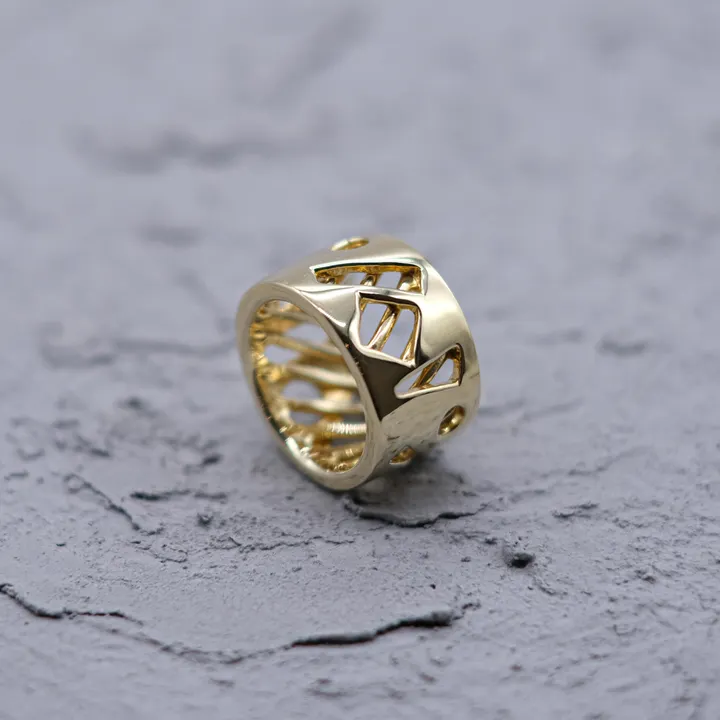 Ring from unbalance collection 表と裏でデザインが違う遊び心満載なリング。 様々な図形模様が施されており、着用すると裏の縞模様が浮かび上がります。