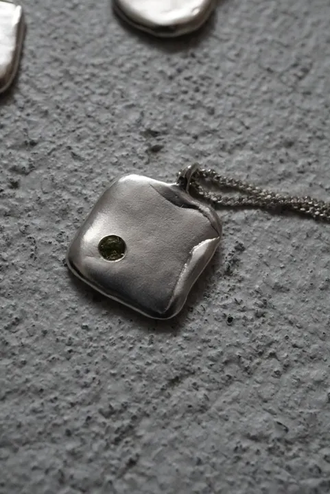 作り込みすぎていないナチュラルな側面と表面から成る四角いペンダント。 ペリドット、ガーネット、スモーキークォーツの3種類の天然石を埋め込みました。 ペリドット:太陽の石と称されるように、明るいエネルギーに満ちています。 眺めていると怒りや悲しみなどのマイナスの感情を取り除き、平穏で前向きな気持ちになれるパワーを与えてくれます。厄除けのお守りにもおすすめの石です。 ガーネット:ガーネットは別名「勝利の石」。 忍耐力と精神力を養い、困難や障害に負けず、前向きに乗り越えられるよう力を貸してくれます。 また、恋愛の成就にも効果を発揮するといわれています。 スモーキークォーツ:精神の安定を促し、ストレスを鎮めて心をリラックスした状態に導いてくれます。さらに、貯蓄運を高め、気を浄化し、家庭運を向上させるとされています。 また、インスピレーションや発想力を開花させ、人間的な成長を促進する効果もあります。 お好きな石をどうぞ。 Natutal silver tone : 光沢を若干抑え、よりナチュラルなトーンで製作しました。 どんなスタイルにもマッチします。 Recycled silver 925 Size : 1.5×1.5cm / chain 42cm 【ご購入前にご確認ください】 ・スモーキークォーツの石のカラーは、半透明から薄い茶色まで色味が様々です。写真は一部の例となりますので参考にご覧ください。 ・Handcrafted 商品の為、一つひとつ多少形が異なります。 ・Silver製品は細かな傷等がある場合がございますが、不良品ではございません。 ・シルバーの特性上、柔らかく傷つきやすい為、商品を取り扱う際は優しくお取り扱いください。