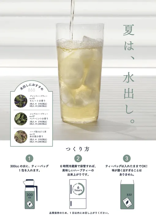 「水出しハーブティー」のPOPです。 水出しにおすすめな商品イメージと飲み方ガイドです。 ラミネート済みでのご用意です。 お客様へのご案内などにご活用ください。 ※データで欲しいという方は個別にお問い合わせください。