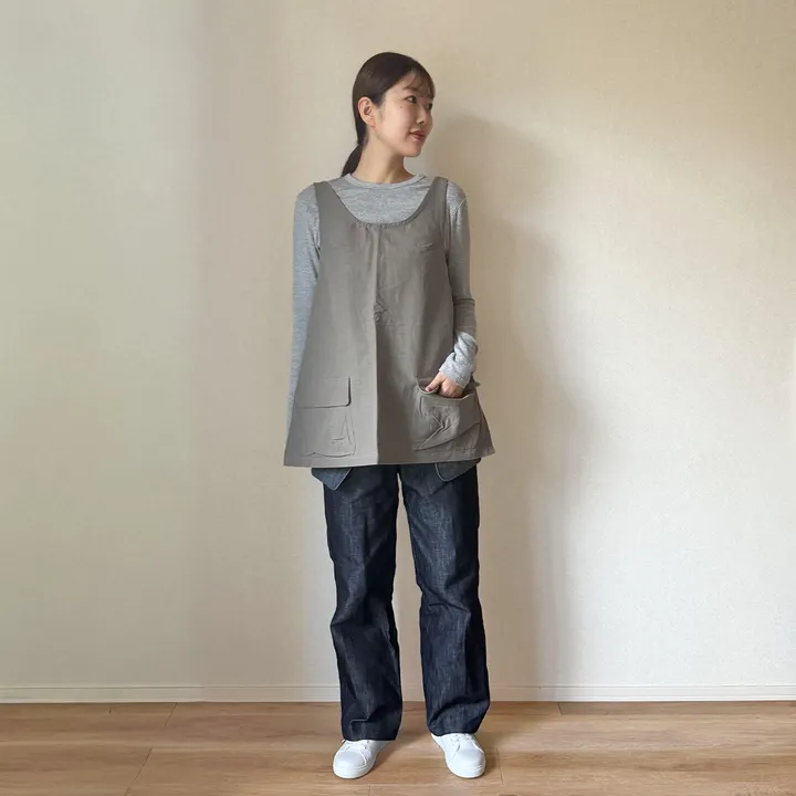 ワークウエアとしてもトップスとしても活躍の場が広がるベスト シンプルなデザインで、重ね着にも最適 スタイリングしやすいベスト ショートパンツ、ワイドパンツ、ロングスカート、ワンピースとなんにでも合わせて楽しめます オールシーズン着回しできる万能アイテム さらりとした肌触りが気持ち良い 自然素材のリネンとコットンの混紡 ポケットを覆う雨ぶたフラップ&マチ付きでたっぷり入るポケットが特徴的 ふたが付いているので うっかり入れたものが落ち難く安心です! うしろ姿は ウエストより少し上で紐を結ぶタイプ 紐をギュッと結んで ギャザーを多めにしたらちょっとガーリーで、お好みのサイズ調節ができます
