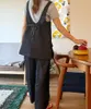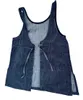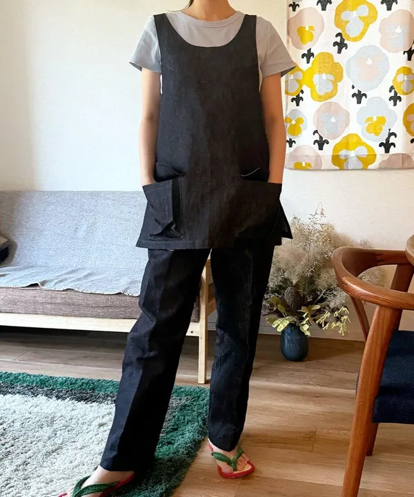 ベスト・デニム ワークウエアとしてもトップスとしても活躍の場が広がるベスト シンプルなデザインで、重ね着にも最適  スタイリングしやすいベスト ショートパンツ、ワイドパンツ、ロングスカート、ワンピースとなんにでも合わせて楽しめます オールシーズン着回しできる万能アイテム ライトデニムでさらりと軽い素材 ポケットを覆う雨ぶたフラップ&マチ付きでたっぷり入るポケットが特徴的 ふたが付いているので うっかり入れたものが落ち難く安心です! うしろ姿は ウエストより少し上で紐を結ぶタイプ 紐をギュッと結んで ギャザーを多めにしたらちょっとガーリーで、お好みのサイズ調節ができます