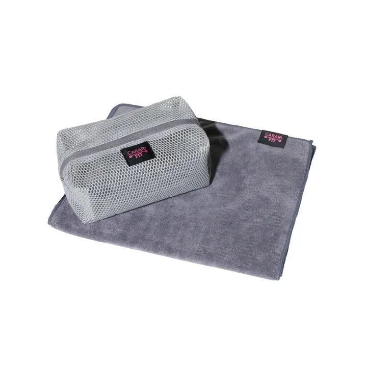 【carari カラリフィット】フィットネスのための、フィットするタオル。 フィットネスのための、フィットするタオル「carari カラリフィット」。巻きやすく結びやすいスリムなロングサイズで、これ1枚で何役もこなせます。使う人それぞれのライフスタイルに寄り添うタオルです。 スリムなロングサイズで使い方いろいろ 本製品はスリムなロングサイズ(W1,100×D300mm)かつ薄手仕様です。首に掛けても結んでもかさばらず、首元の汗をすっきり吸収してくれます。ロングサイズなので、動いてもずれ落ちにくく、両手が自由に使えます。スリムな形状のため、頭に結んでもしっかり固定できます。 様々なシーンで活躍 運動中の汗対策、日差し除け、髪をまとめるときなど、様々なシーンで活躍します。薄手なので、広げて肩に掛けても軽やかに過ごすことができ、汗取りだけでなく冷え対策にもぴったりです。 専用ケース付きで持ち運びに便利 ケース付きで、持ち運びに便利です。使い終わったら専用ケースにすっきり収納できます。ケースは通気性の良いメッシュ生地でできており、濡れたままでも持ち運びやすい設計のため、ジムやサウナにもぴったりな1枚です。 商品情報(スペック) 商品名:carari カラリフィット (Sports Towel + Mesh Case) カラー:グレー、ライトグレー サイズ:[本体]W1,100×D300mm [ケース]W180×D100×H80mm 重量:143g(ケース込み) 主材質:[本体]ポリエステル、ナイロン [ケース]ポリエステル 原産国:中国