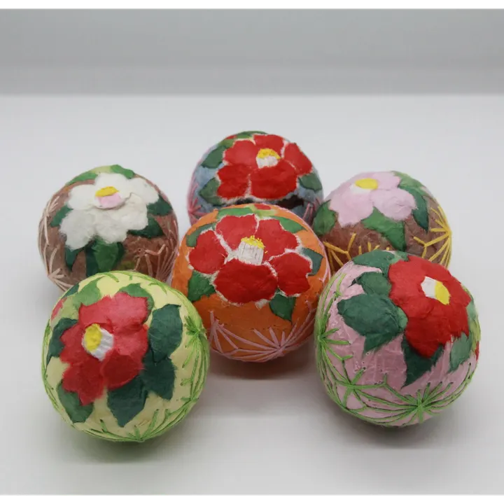 伝統的な糸てまりの手法に加えて、 地元の手漉き和紙『出雲民芸紙』を用い、 四季折々の草花などの素朴で美しいちぎり絵をてまりに表現しました。 こちらは椿の花の 5センチの小さな和紙てまりです。 ★地色や花の色などにご希望がございましたらご相談ください。 ※こちらの商品は1つ1つ手作業で制作している為、色や形に違いが出る場合がございます。 ※ご購入される個数によっては納品までお時間をいただく場合がございます。 ご希望やご不明な点等ございましたらお気軽にお問い合わせください。