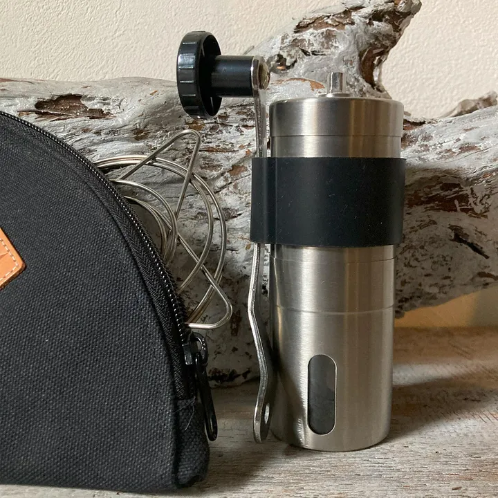 コーヒーミルショートタイプ (ゴムがバー付きにリニューアル) アウトドア・ご家庭で手軽に挽きたてコーヒーを味わえるコーヒーミルです 手動式でハンドルを回すだけで簡単にコーヒー豆を挽けます 細挽きから粗挽きまで粒度の調節が可能で、微粉が少なく均一で安定した粒度をキープします。ハンドルと本体は分解できるので持ち運びが楽々。 分解して丸洗いもできるので衛生的で利便性も抜群です コーヒー好きの方への贈り物にも人気です ショートタイプ:コーヒー豆 最大約20g(約1〜2杯分) サイズ Φ4.8cm×13.5cm(本体) 約15cm(ハンドル長さ) 素材:本体 テンレス・PP・アクリル    取手 鉄・PP    グラインダー部分 セラミック 説明書付き