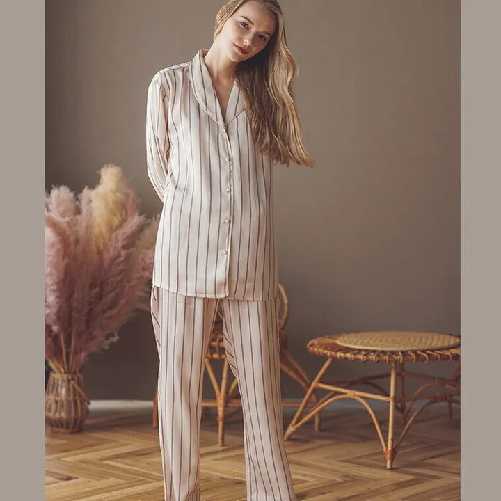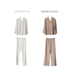 【デザイン・シルエット】 気品溢れるパイピングデザインのサテントップス。 シルエットはスタイルバランスが良く、女っぽさを引き立てます。 気品溢れるサテンロングパンツ。 落ち感のある生地が縦ラインを強調し、美脚効果を高める一着に仕上げました。 さりげない縦スリットも女性らしさを引き立てます。セットアップでお楽しみください。 【素材・サイズ感】ゆとりのあるリラクシーなシルエットのパジャマシャツは パイピングを効かせ、クラス感を添えました。サテンならではの上質な光沢がリラクシーな 穿き心地ながらも女性らしさを纏う大人のムードを演出します。