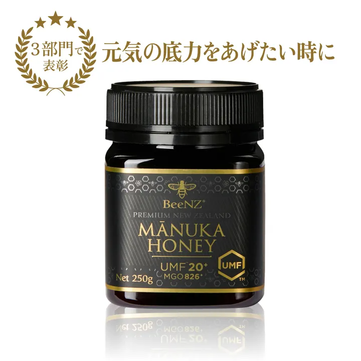 マヌカハニーの特徴 マヌカハニーとは? ニュージーランドの特別な地域に自生する「マヌカ」の木から取れるハチミツがマヌカハニーです。優れた薬効を持つことから、ニュージーランドの先住民マオリ族はマヌカハニーを万能薬として用いていたといわれています。 その豊富な栄養成分と活性成分が注目され、ナチュラルスーパーフードとして世界中で人気が高まっています。 ※MGO(メチルグリオキサール)とはマヌカハニーにだけ見られる希少な抗菌成分です。 BeeNZのマヌカハニー STEP1. 環境作り 他からの農薬などの影響を受けない大自然の中に養蜂場を構え、熟練の養蜂家が健康なハチを育てます。 STEP2. 抽出 確かな設備を備えた自社工場で丁寧にハチミツを抽出します。 STEP3. ボトリング 政府機関認定のプロセスに従ってハチミツをボトルに詰めて出荷します。 BeeNZ(ビーエヌゼット)の名前の由来はBee(ハチ)+NZ(ニュージーランド)。BeeNZ社はニュージーランド北島のカティカティに本拠地を置くハニーメーカーで、世界14か国にハチミツを輸出しています。 安心・安全・高品質 BeeNZ(ビーエヌゼット)のマヌカハニーは無添加・抗生物質不使用! ニュージーランドの認定機関が出しているUMF認証ももちろん付いています。