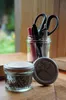 山猫瓶詰研究所の瓶詰商品で使っているオリジナル瓶。 大・中・小の3種類展開。 瓶には金色のロゴが刻まれた蓋もついています。 カトラリーや文房具入れにはもちろん、 ホールスパイスやコーヒー豆、お菓子の保存。 自家製のジャムやドレッシング、ソースの保存にも。 直径はすべて同じなので、すっきり収納できます。 =サイズ・仕様= 直径:6.5cm 大…高さ:11.4cm / 容量:200ml 中…高さ:6.8cm / 容量:100ml 小…高さ:5.1cm / 容量:60ml