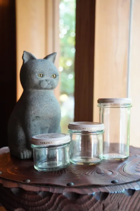 山猫瓶詰研究所の瓶詰商品で使っているオリジナル瓶。 大・中・小の3種類展開。 瓶には金色のロゴが刻まれた蓋もついています。 カトラリーや文房具入れにはもちろん、 ホールスパイスやコーヒー豆、お菓子の保存。 自家製のジャムやドレッシング、ソースの保存にも。 直径はすべて同じなので、すっきり収納できます。 =サイズ・仕様= 直径:6.5cm 大…高さ:11.4cm / 容量:200ml 中…高さ:6.8cm / 容量:100ml 小…高さ:5.1cm / 容量:60ml