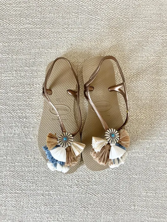 HAVAIANASのサンダルに、 オリジナルパーツやムートンをあしらい、ハンドメイドしています。 柔らかな鼻緒で定評があり、履きやすいです。