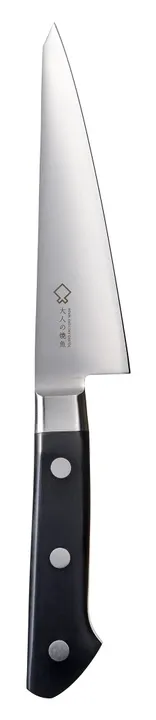 骨すき包丁は骨から肉をはがすために使用する包丁ですが、刃が厚く丈夫で、出刃包丁の代用として魚をさばくのに便利です。骨と身の間にスッと入り込みやすい細く尖った先端形状です。力を入れやすい刃の厚みで、硬い骨に当たっても刃が欠けにくく頑丈です。コバルト合金鋼とステンレス鋼の複合材で切れ味のよさとお手入れの手軽さを両立。ハンドルは、経年変化に強くアウトドアナイフに使われる積層強化材を使用。長く使ってもやせにくく抜群の耐久性を誇ります。刀身とハンドルの接合部は、汚れが溜まりにくく衛生的で丈夫な口金付です。燕三条の包丁ブランド「藤次郎」の熟練した職人が、手作業で一丁ずつ丁寧に刃付けをしています。
