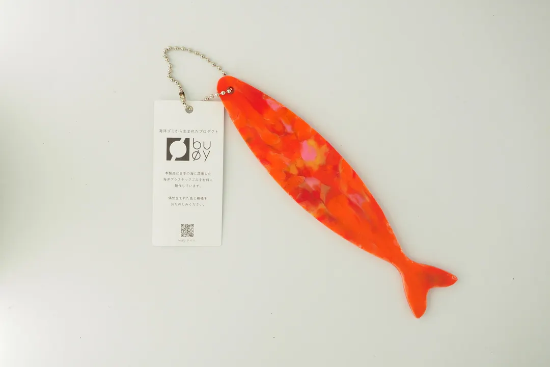 お魚形のシンプルなキーホルダー。 buoyの製品は全て日本各地で回収された海洋プラスチックごみを材料に作っています。着色などの加工を加えず、偶然海岸に漂着した色味でできています。 明るい発色が特徴のプラスチックですが、複数の色が交じり合うことでちょっと有機的なモザイク模様が特徴です。 製品にはひとつひとつゴミの漂着地域が明記されています。日本で起きている海洋ごみの問題をリアルに感じることができます。 また、商品に添付されているQRコードを読み込むとそれぞれの回収を行ったビーチクリーン団体さんの情報を見ることができます。 ------------------------------------------------------------------- 海洋プラスチックごみを材料に変える独自技術buoyの特徴 (buoyは海洋プラスチックごみ素材使用を前提にした株式会社テクノラボの独自技術により成形しています。株式会社テクノラボは本技術において特許取得済み) ◆材料を分けないで成形するため生まれる独自の模様 材料はすべて着色せず海洋ごみの色を活かして成形しています。偶然生まれる色と模様は回収された漂着ごみによって決まります。 ◆製品の重さが海洋ごみの重さ 製品をコーティングしているフィルム以外、混ぜ物などせず海洋ごみでできているので製品の重みから海洋ごみ問題を感じられます。 ◆製品にすべて材料の漂着地を明記 buoyは日本各地のビーチクリーンボランティアや企業の方から材料を提供していただいています。これらの材料は時期と地域を分けて管理され、製品にはすべて材料産地のシールを貼り販売しています。 buoyの材料産地をきっかけに回収された地域のことを知ってほしいとの思いからbuoyでは団体様の紹介ページを作成しています。 http://www.techno-labo.com/rebirth/partner/ -------------------------------------------------------------------