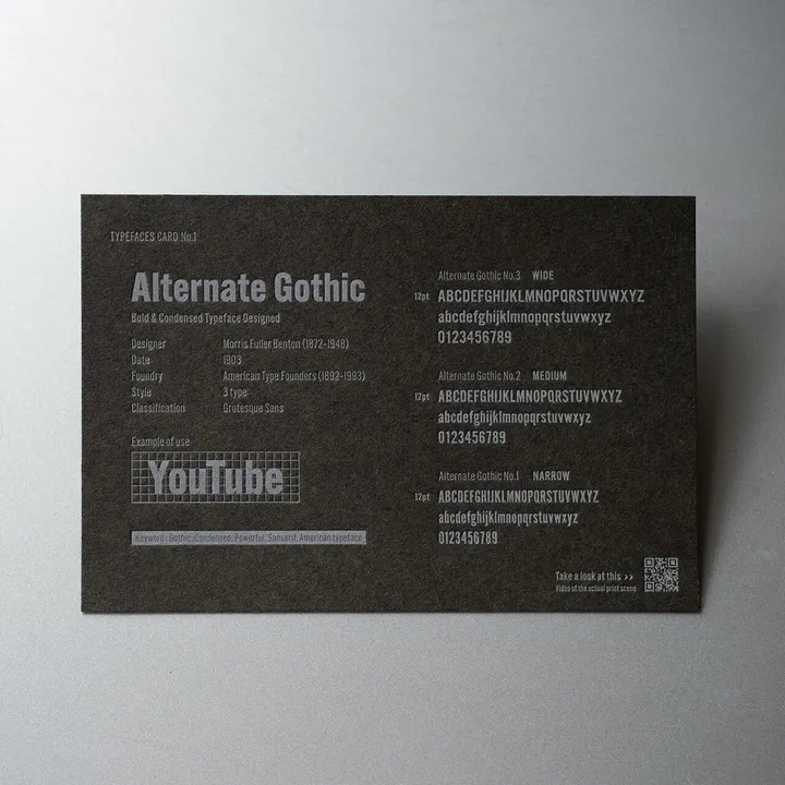 活版印刷工場が作るこだわりの詰まったポストカードです。 私たちが所持している活字書体「オルタネート・ゴシック」を紹介しています。 【フォント解説】 100年以上前に誕生したサンセリフ系の縦長ゴシックの代表格です。歴史のあるフォントですが、「YouTube」のロゴにも使用されているためとても身近なフォントと言えるでしょう。スリムな書体は限られたスペースの中でもたくさんの文字を並べることが出来ます。 QRコードを読み取っていただくと、印刷風景の動画をご視聴いただけます。 【SIZE】148×100㎜ 【PRINT】活版印刷1色 (オペークホワイト) 【PAPER】GAファイル チャコールグレー 310k 【OTHER】63円切手でお送りいただけます。 ※写真はイメージとなります。