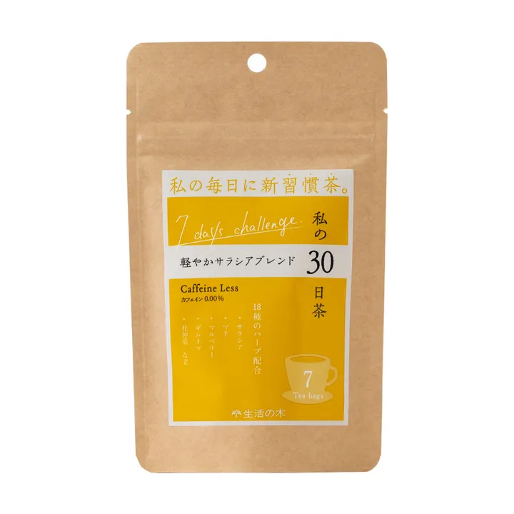 心と体に気持ち良い習慣を始めていただくための「私の30日茶」です。 日々の生活の中で無理なく、美味しく、楽しみながら飲み続けられるよう、とにかく美味しさにこだわりました。 ゴクゴク飲めて、身体に染みわたるようなブレンドに仕上げています。 軽やかサラシアブレンドは、サラシアやマテ、杜仲葉など18種類のハーブを配合しています。食事に合わせやすいマテローストの程よい苦みと、ほのかにスパイシーな香りが特徴です。 【7ティーバッグ】 1週間のお試し用に。 袋のトップに穴があいておりフック陳列が可能。 個包装タイプではありません。 【30ティーバッグ】 まずは30日召し上がっていただくために。 携帯に便利な個包装タイプなので、オフィスや旅行先への持ち運びにも。 【90ティーバッグ】 しっかり3ヶ月間継続的に飲用していただくために。 1日に数回召し上がる方や、家族やオフィスのみんなで飲む場合にも便利です。 個包装タイプではありません。