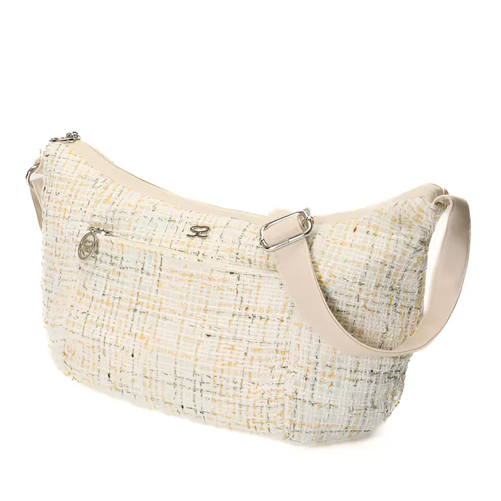 ホワイトに、グリーンやイエローなどの色が入った。あかるいツイード素材の可愛らしいショルダーバッグです。旅行やお出かけにぴったり☆開口タイプ/ファスナー式■ポケット/ (内側)ファスナー×1、オープン×2(外側)前ファスナー×1