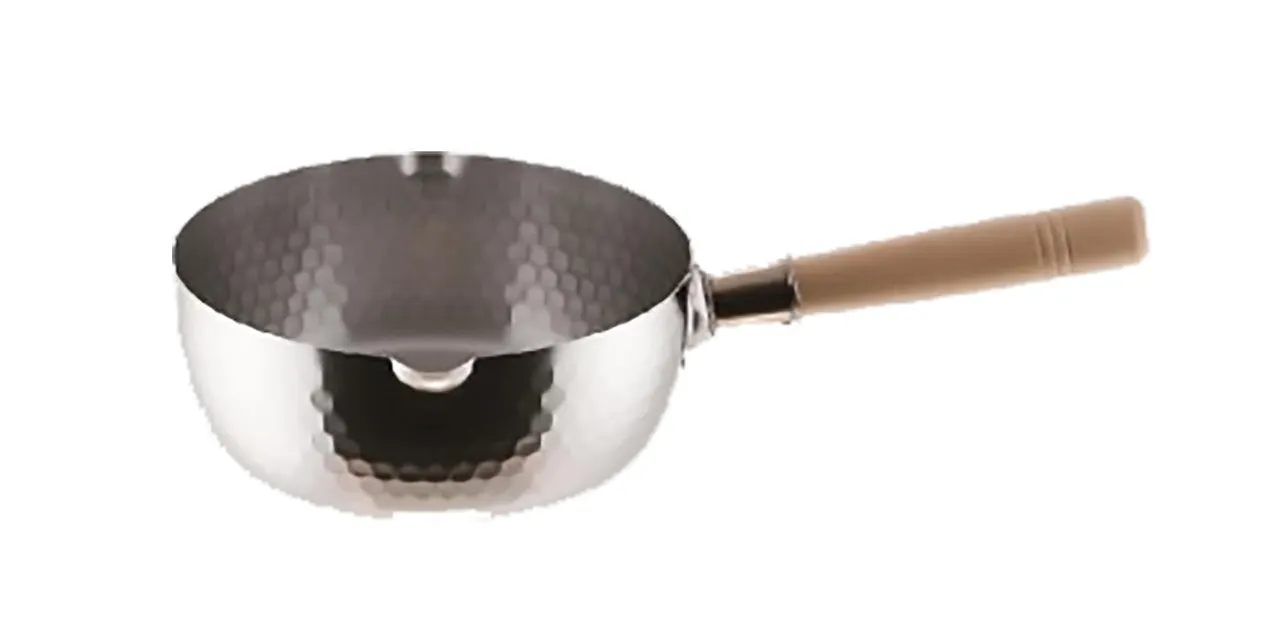 ステンレス製の雪平鍋です。ガス火はもちろんIH200V対応で、手に馴染みやすい木製のハンドルです。簡単な計量もできる目盛付。