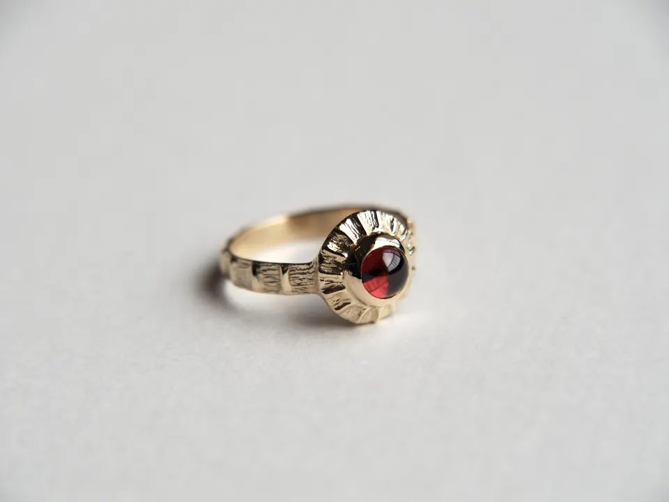 ・コンセプト 「心の内に秘めた光を引き出し、身に纏う人そのものを輝かせたい。」人は誰しも、心にきらりと輝く光を持っています。その光は、人それぞれに形が異なるからこそ美しく、素晴らしい。Rinnは、心に宿る光に寄り添うように、身につける人そのものを輝かせるジュエリーを提供しております。 「毎日身につけても壊れにくく、時を重ねるとともに肌に馴染んでいくようなジュエリーを」 Rinnは身につける人の肌と生活に馴染むジュエリーを提供しております。 ・デザイン 「他になく、永く愛されるデザインを。」 ジュエリーのデザインは、日常に溶け込んだささやかな美しさから生まれます。 例えば揺らめく布の柔らかさに触れた時や、朝陽が昇る瞬間に霞んでいたものが透き通って見えた時、感じ取った自然の美しさがジュエリーの形になっていきます。 そこへクラシカルな要素を取り入れることで、"Rinnにしかないデザイン"を意識いたしました。 お客様の生活に寄り添い続けるために、永く愛され続けるデザインにこだわりました。 そこには「親から子へと、時代を超えて受け継がれていって欲しい」という想いも込めております。どんな人にもどんな装いにも、しっくりと馴染み続けていくよう願いを込めてジュエリーを製作しております。 ・アイテム 天然石を中心置き、指輪の腕部分にまで精細な装飾を施した16世紀ごろのリングをモチーフにしたリングです。 ガーネットの赤とゴールドがゴージャスな印象です。