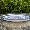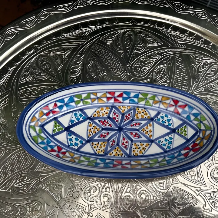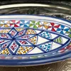 サイズ:約24×11×高さ3cm ※デザインは入荷時により多少異なることがございます。 チュニジアで陶器の町といえば「ナブール」 鮮やかな手つきでロクロを回し、その後で皿に絵付けをしている女性の手つきの見事さに感嘆。 たくさんある中でもよりすぐりの皿ばかりを選んでおります。 *「ナブール」は観光客だけでなく、チュニジア人でも陶器を買いに行くときは「ここ!」、というほど陶器の街として知られています。 この町の工場で職人が1点1点鮮やかな手つきでロクロを回し、皿に絵付けをしている女性の手つきの見事さに感嘆します。 中心から放射線状に広がる模様は、ほとんどの工房がこの柄で絵付けするほどオーソドックスです。 色鮮やかな文様は食べたあとでも食卓を華やかに演出してくれます。 *400年以上歴史のあるチュニジア伝統の絵付け陶器の街ナブールから、地中海の風をお届けします。 *ナブールは瀬戸市と姉妹都市です。