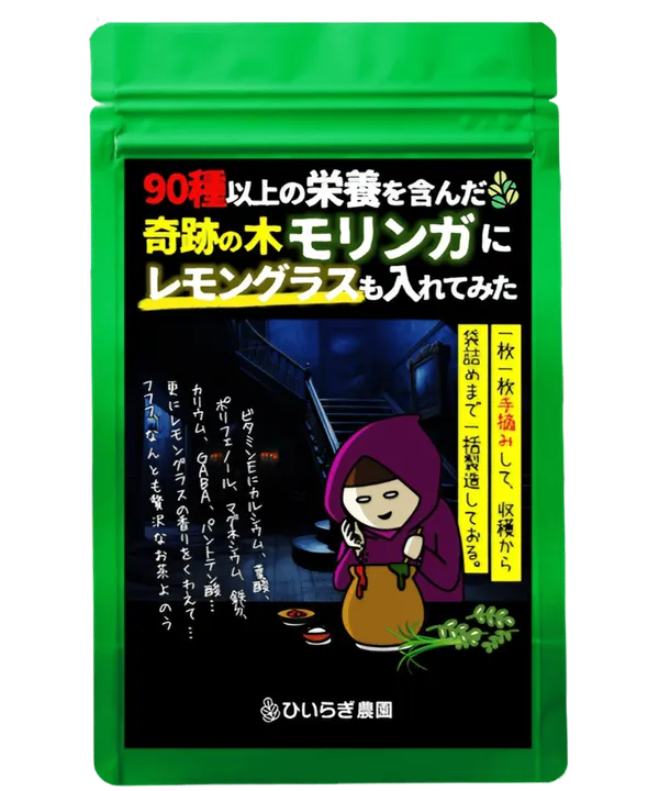 毎日の必要な栄養素、食事だけで足りてますか? 足りていない栄養素を、毎日のモリンガ茶で補いましょう。 モリンガにレモングラスをブレンドしたすっきり飲みやすい健康茶です。 ◉モリンガとは 北インドなどが原産のワサビノキ科の植物で、ハーブの一種。 その独特の葉や形状から『奇跡の木』や『薬箱の木』と呼ばれるスーパーフードです。 ▼こだわり ❶ひいらぎ農園のモリンガは、栽培期間中、農薬も化学肥料も使わず、土と堆肥の力のみで栽培しています。 ❷特に栄養価が高いと言われている栽培一年目のバージンモリンガのみを使用。ひとつひとつ丁寧に手摘みしています。 ❸ひいらぎ農園は、フラワーアレンジメントの土台や祭壇などに使われる鑑賞用シダ「レザーリーフ」(レザーファンとも呼ばれます)の栽培農家。いわば、【葉ものづくりのプロ】であり、レザーリーフ栽培で培ったノウハウを、モリンガ栽培に活かしています。 ❹手作業で一枚一枚、モリンガの枝葉を選別しています。手間と時間はかかりますが、スタッフの手と目で、異物除去や品質の保持に努めています。 ❺独自の乾燥製法により、生き生きとしたグリーンをキープ。「1包で数杯飲める」「フレッシュさがあって、飲みやすい」などお客様からも喜ばれています。 ❻収穫してすぐに乾燥、加工しているので、とにかくフレッシュさが自慢です。火を通すとせっかくの豊富な栄養素が失われることにもなるので、当園のモリンガ茶は非焙煎仕様。フレッシュな風味が苦手な方は、レモングラスをブレンドした「手摘みモリンガレモングラス」をお試しください。 ❼最大の特長は「食べられる」こと。茶葉はもともと乾燥したモリンガ葉、農薬も使っていないので日常の食卓でお楽しみいただけます。出がらしの茶葉は、是非、捨てずにお味噌汁に入れたり、納豆に混ぜるなどお料理に加えてお召し上がりください。 また、ティーバッグから中身を取り出して、乾燥野菜の代わりとしてお料理に使っていただくことも出来ます。モリンガの栄養を余すことなく摂取しましょう! ◉味わい ティーバッグは、より抽出しやすいようテトラ型。 レモングラスのさわやかな風味が口中に広がる飲みやすいお茶です。