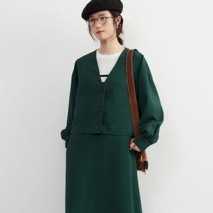 KNXU506・セットアップ商品ワッフル調生地のボレロ風ジャケット付きジャンパースカートセット FREE/GREEN