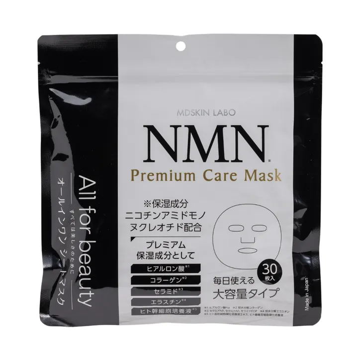 NMN※1を配合! Made in Japanのフェイスマスク!! キメ細かなハリのある艶やかなお肌に! ※1 ニコチンアミドモノヌクレオチド(保湿成分) Premium Care Mask NMNは、酵母や酵素の研究から発見された新しいビタミンB3です。 年齢を重ねた肌にうるおいを与える成分「NMN※1」を配合したエイジングケアマスクで肌本来のコンディションを高めます。 キメ細かなハリのある艶やかなお肌に! ■5種のプレミアム保湿成分配合 ヒアルロン酸、コラーゲン、セラミド、エラスチン、ヒト幹細胞培養液 ※ニコチンアミドモノヌクレオチド(保湿成分) 化粧水、乳液、美容液、パックの4役がマスク1枚に凝縮されてるオールインワン。 大容量30枚入りで、リーズナブルなお値段なので、お財布にもやさしいマスクです。 5つの無添加 ●無香料 ●合成着色料不使用 ●鉱物油不使用 ●紫外線吸収剤不使用 ●石油系界面活性剤不使用  ※あくまでも、商談資料となります。薬機法上問題のある表現は最新の注意をしておりますが、バイヤー様の小売販売時には最新の薬機法をご確認いただきますようお願いいたします。