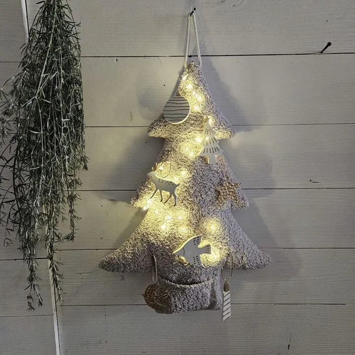 オーナメントを吊り下げてカスタマイズできるハンギングタイプのツリークッション。 ドアや壁に簡単に吊り下げることができ、8個の小さなリングにオーナメントを飾ることができます。 自分だけのオリジナルツリーを作り上げる楽しさを提供します。 さらに、ツリーの下側にはポケットが付いており、電池タイプのLEDライトを巻き付け、ポケット内に電池ボックスを収納することができます。 これにより昼間はオーナメントが輝き、夜には優しく光るツリーに変身します。 クリスマスのインテリアを一層特別に演出できるアイテムです。