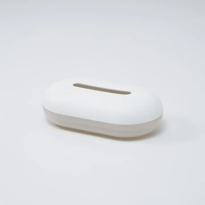 ツートーンデザインのソフトパックティッシュ専用ティッシュケース 下半分が透明になっており、さりげなくティッシュの残量を確認できます。 上半分のニュアンスのある素材とカラークリア素材のツートーンでオブジェのような装いです。 スリムなソフトパックティッシュにぴったりのケース。 適度な重みがあり、ケースが浮き上がらずスムーズにティッシュを引き出せます。 コンパクトなサイズ感は置く場所を選びません。 角のないフォルムは空間をやさしく演出します。 別売りのウェットティッシュケースとセットでお使いいただくことで統一感を出し、暮らしの質を高めます。 水に濡れても問題ない素材なので、洗面所やキッチンなどでも気兼ねなくお使いいただけます。 シンプルな構造なのでお手入れがしやすく、清潔な状態を保てます。 リビングや寝室、洗面所まで幅広くどんな空間にもなじみます。 残量が見えるさりげない機能性を兼ね備えた、お気に入りのアイテムと一緒にインテリア感覚で飾りたくなるデザインです。 お米のもみ殻を含むバイオプラスチックTEXaと再生ポリカーボネートを使用した環境に配慮したプロダクトです。 TEXaはお米のもみ殻の粒が見えて、陶器のようなマットでやさしい質感を実現。 透明感の美しい再生ポリカーボネートは自社の製造過程で出るロス品等をリサイクルしています。 サステナブル素材の特性上、粒感や色味のニュアンスに個体差があります。表情の違いをお楽しみください。 国内の自社工場で生産している日本製。 :: soemとは 大阪で100年続く業務用プラスチック製品メーカーが「愛着を持って長く大切に使っていただく」をコンセプトに展開するブランドです。 機能性と飾りたくなるような心に響くデザインに、長く大切に使っていただきたいという思いを込めています。