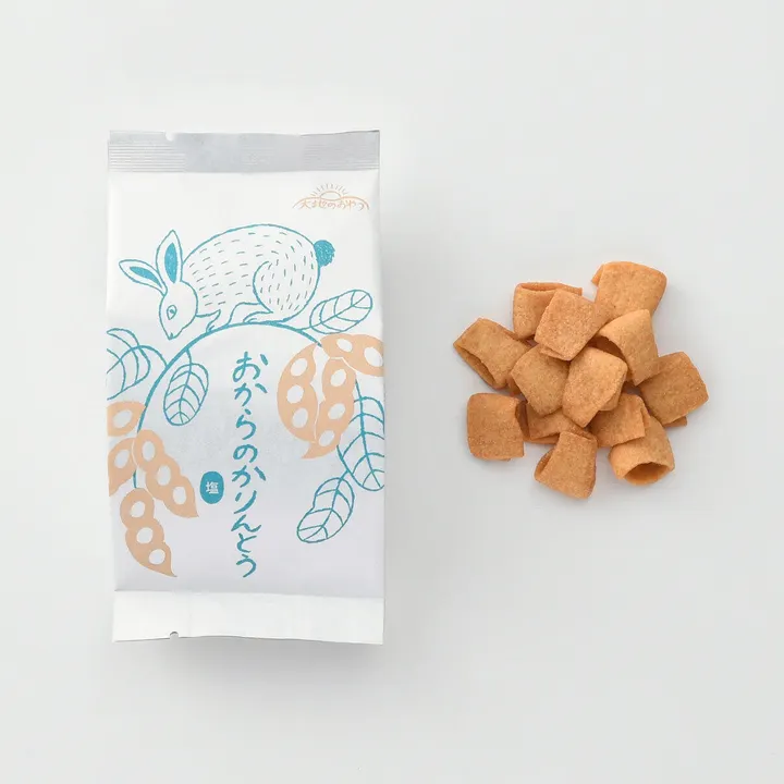 厳選した国産大豆のおから、 愛知県産小麦粉、粗糖で作った生地を、 圧搾一番搾りの菜種油で揚げました。 黒糖の穏やかな甘みがよく合う波形の「黒糖」、 ほのかな塩味が後を引く半わっか形の「塩」の2種類。 カリッとかための食感を楽しみながら じっくりと噛みしめて味わっていただきたい 素朴なおからかりんとうです。