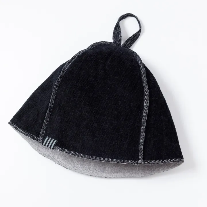 こちらはドラマ『サ道』で衣装協力した商品です。 これまで300個以上を販売した人気商品です。 サウナハットの効果 ①のぼせ防止(遮熱)②髪と頭皮の保護③外界からの遮断④ファッション コットン100%タオル生地の2枚仕立てです。 シャーリングタオルという起毛がループ状になっていない生地で、毛足が短く光沢があり高級感があります。フワッとした手触りです。 黒地にグレーのステッチがポイントです。裏返すとグレーになり、2色を楽しめます。 便利に使えるポケットと、引っ掛けループ付きです。 かぶる場所を選ばないシンプルでシックなカラーは普段使いや瞑想サウナにもぴったりです。 商品の特徴 ・リバーシブルで使える ・洗濯機で洗える。 ・中とじをしていないので広げて早く乾かすことができる。 ・ゆったりかぶれるフリーサイズ、耳が隠れて目深にかぶれる ・生地がループ状になっていないのでアクセサリーなどを引っ掛ける心配がない。 ・ポケットに熱くなるロッカーキーやなくしやすい耳栓などを収納できる。飛び出し防止のスナップ付き。 ・引っ掛けループ付きでフックにかけられる。 使い方 乾いたまま、サウナ室でかぶるだけです。