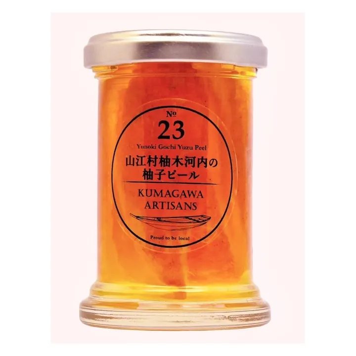 熊本県南部を流れる球磨川の支流、万江川のほとりにひっそりと、美しくそして豊かにたたずむ柚木河内地区。透き通る清流のほとりにその地名そのままに育つ柚子があります。栽培期間中は農薬を使用せず、養蜂の巣箱のそばで育つ柚子は生産者・山口さんご夫婦のように清廉で美しく優しい柚子です。私たちはマーマレードのほかにも美しすぎるこの柚子をピールのままお届けしたくなり、一つ一つ手で処理して美味しいシロップ漬けにしました。シロップには果汁を加え、さわやかな酸味にすっきりとした甘さに仕上がりました。そのままお茶うけとして、またチーズにのせて、ケーキに刻んで入れたり、使い方はたくさんあります。シンプルだからこそその魅力を存分に試していただけると確信しています。