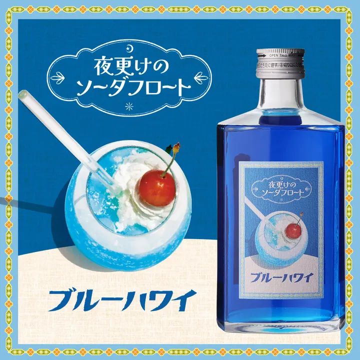 【青くて甘い大人のソーダフロートで今夜は夜更かし、してみませんか?】 喫茶店で飲むソーダフロートのおいしさをお酒にしたら?その答えがこの「夜更けのソーダフロート」。 甘酸っぱくてどこか懐かしいパイナップル風味の味わい。グラスにたっぷり氷を入れて、ゆっくりソーダを注ぎ入れ、ソフトクリームをトッピングすれば、大人のソーダフロートの完成。これが甘くて爽やかでゴクゴク飲めちゃう! 【「夜の濃厚ミルクシェイク」はいかが?カルピス+ミルクで割ってみて!】 ミルク割やカルピス割(カルピス&ミルク割)も大変おすすめの飲み方です。特に、ちょっと高級な“プレミアムカルピス”で割ると、濃厚なミルクシェイク風の味わいになります。ほかにもレモンソーダやジュースで割ってみたり、ライムジュースとシェイクして縁に塩を塗ったカクテルグラスでいただいたり。 ぜひ、お気に入りの飲み方を見つけてください! 【かき氷にかけてもいいね!「アルコール7%」もうれしい】 アルコール度数は7%と低めだから、お酒が弱い人でも安心。暑い日は昼間からガリガリかき氷を削って上からかけるも良し、夜更けにバニラアイスを食べるときに上からかけるのも背徳感抜群(笑)。 夜更けに限らず、暑い日中にも、夕暮れ時にも、そしてもちろん真夜中にも、是非是非気軽に楽しんでもらいたいお酒です! ◎おススメの飲み方 ・ソーダ割+アイス:ソーダフロート風にして、爽やかな甘さを楽しむ。 ・ミルク割・カルピス割:濃厚な大人のミルクシェイクとして楽しむ。 ・カクテル:ライムジュースと一緒にシェイクすれば、おしゃれなカクテルに変身。 ・シロップとして:かき氷やバニラアイスにかける、背徳感のある楽しみ方もおすすめ。