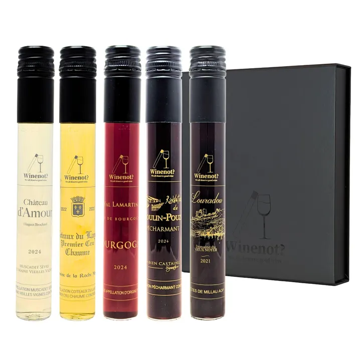 100mlワインギフト - Winenot? 『ワインノット?ージュネーズ』で大切な人と想い出を作りませんか?おしゃれなギフトボックスには、フランス産の人気ワイン、赤ワイン3本と白ワイン2本(各100ml)が入っています。ご友人やご家族との特別な日のお祝いや、ご自分へのご褒美にもご活用できるギフトセットです。 Wine Selection 1. ル・ヴァル・ラマルティニャン- カーヴ・エミール・シェイソン 赤ワイン|原産地呼称:AOCブルゴーニュ|ブルゴーニュ産|ピノノワール(100%)|HVE3 - サスティナブル農法|アルコール13%|フードペアリング:赤身肉やソースを使った肉料理、風味豊かなチーズ|飲み頃温度:16 ~ 18℃| 2. レヴェラシオン - ドメーヌ・ド・ムーラン・プジィー 赤ワイン|原産地呼称:AOC ペシャルマン(AOC Pécharmant)|ベルジュラック産|メルロー(25%)、マルベック(25%)、カベルネ・ソーヴィニヨン(25%)、カベルネ・フラン(25%)|HVE3 - 有機農法|アルコール14%|フードペアリング:赤身肉、マッシュルーム、ジビエ肉、チーズ|飲み頃温度:室温| 3. キュヴェ・ロウラドゥ - ドメーヌ・ドゥ・ヴィユ・ノワイエ 赤ワイン|原産地呼称:AOPコート・ド・ミヨー|ギド・アシェット1ツ星 2020 & 2022|シュッド・ウエスト(アヴェロン)産|シラー(60%)、ガメイ(30%)、カルベネ・ソーヴィニョン(10%)|ビオロジック農法|アルコール13.5%|フードペアリング:赤身肉、クスクス、ブランケット、オリーブを使った鴨料理、プルーンを添えたローストポーク|飲み頃温度:16 ~ 18℃| 4. ドメーヌ・ド・ラ・ロシュ・モロー 白ワイン|原産地呼称:ショーム・プルミエ・クリュ・デ・コトー・デュ・レイヨン(Chaume 1er Cru des Coteaux du Layon)|ヴィニュロン アンデパンダン金賞 2019|ロワール産|シュナン・ブラン (100%)|サスティナブル農法 / HVE(2018年~)|アルコール12%|フードペアリング:フルム・ダンベール・チーズ、ローストチキン|飲み頃温度:8 ~ 10℃| 5. シャトー・ダムール 白ワイン|原産地呼称:セーヴル・エ・メーヌ - ミュスカデ・ヴィエイユ・ヴィーニュ (Sevre et Maine – Muscadet Vieilles vignes)|ロワール産|ムロン・ブラン (100%)|伝統農法|アルコール12%|フードペアリング:カキ、甲殻類|飲み頃温度:8 ~ 10℃| ワインカード ワインの詳細が書かれたワインカードを添えてご指定の場所までお届け致します。