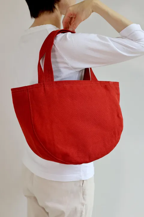 厚手のキャンバス生地と丸みをおびたシルエットが人気のUトートバッグを少し大きく作りました。 用途の幅が広がり、ちょっとしたお出かけがより楽しくなるトートバッグです。 開口部にスナップボタン、内側にファスナー付きポケット1つ。