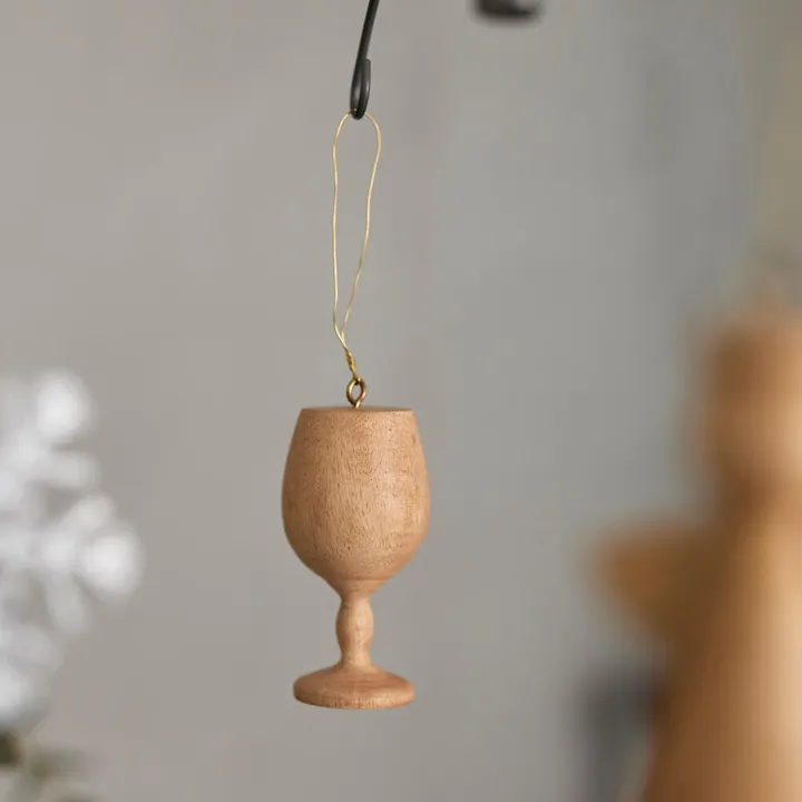 マンゴーウッドで作られたオーナメント。 クリスマスやパーティーシーンに欠かせない脚付きグラスをそのままオーナメントにしました。 一つ一つ職人の手で作られており、無垢の木の『ぬくもり』や『やさしさ』『あたたかみ』を存分に感じることができます。 長年使い込む事で風合いや愛着が増してゆきます。 家族が増えたり世代が変わっても、ひな人形のように大事に長く愛用してほしいアイテムです。 マンゴーの木材は、磨き上げると滑らかで肌触りが良く、綺麗な木目の仕上がりになることから、家具や器などに使われています。 やや粗い肌目とラフな木肌で、ライトブラウンの中に茶褐色、赤褐色が混じったような木目が特徴。 木目には黄みや黒みが混じるものがありますが、自然素材ならではの表情があり、ひとつひとつがまさに一点モノです。 木目や色味には個体差があります。 自然の木材を使用しておりますのでご理解くださいますようお願いいたします。 【インテリア】【雑貨】【クリスマス】