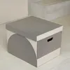 フタを開けずにいつでもスイスイ出し入れできる 気楽な収納ボックス 前面が可動式になっており、上部のフタをしたまま物を出し入れ出来ます。 「あの箱の荷物を取りたい」「これをあの箱に入れたい」 そう思った時に、いちいち箱を持ち上げたり引っぱり出したりする必要がありません。 A4サイズの書類も入るサイズで、出し入れが多いアイテムの収納にピッタリ。 おもちゃや日用衣類、よく使う食品のストック、こまごまとした雑貨など 散らかりやすい物もスッキリ片付きます。 素材には100%リサイクル紙を使用し、環境にも配慮しています。 ご使用後は段ボール資源としてリサイクルに出すことが可能です。 パッケージにもこだわり、従来の素材と比較し燃焼時に発生するCO2が削減されるものを選びました。