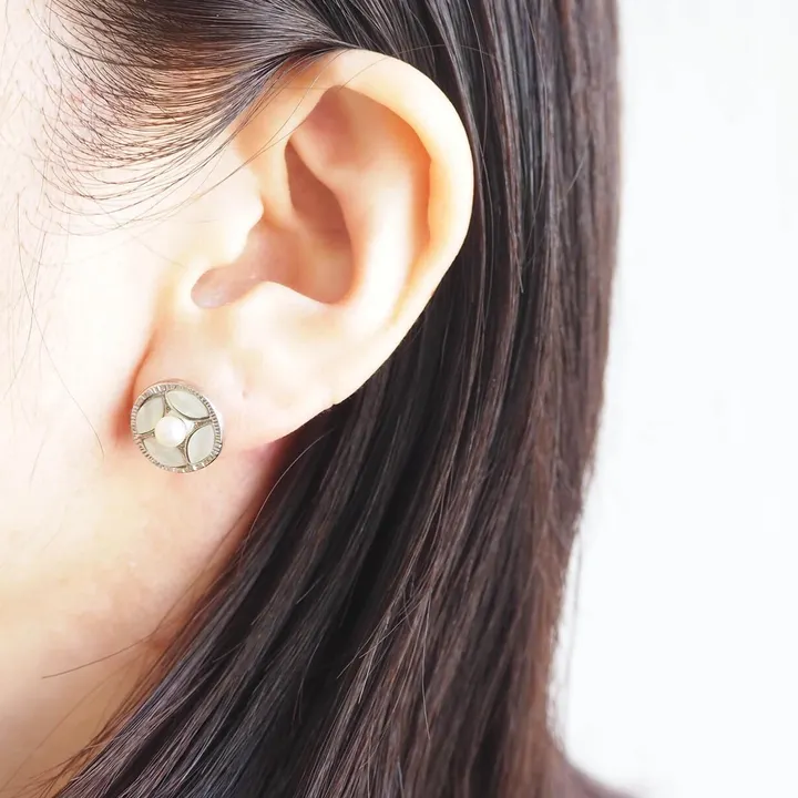 ピアス【Vintage】/淡水パール+マーキス白蝶貝ラウンドピアス クリーンなヴィンテージテイスト薫る シルバーカラーのコレクション ラフなスタイリングが映えるシーズンは アクセサリーもいろんな素材やカラーに挑戦できて、装う楽しみが湧き立ちますね。 少しカジュアルなコーデのときにも、きちんと見えするアクセサリーが耳元に光ると 何だかとっても安心できるし自信が持てるもの。 こちらのコレクションでは クリーンなシルバーカラーと天然素材との異素材MIXのアイテムでありながら ナチュラルに偏らずきちんと見えも叶ってしまう、イヤリング&ピアスが揃います。 ロジウムメッキによる落ち着きあるトーンのシルバーカラーと、天然素材の淡水パールやシェルの美しい輝きを活かし Oucaらしいヴィンテージテイストもしっかりと織り交ぜました。 特徴あるカラーや素材のテイストでも、これならオールシーズン手にとれる! そんな普遍的な魅力もプラスした、新鮮なシルバーカラーのアイテムたちです◎ ////////////////////////////// 天然素材 「マザーオブパール」の魅力 ////////////////////////////// 今回メインの素材として用いたのは 「マザーオブパール」と呼ばれる真珠をつくりだす母貝。 母貝にはいろいろな種類があることからマザーオブパールにも様々な色調が存在します。 パールのような美しい照りと光沢があり、透明だったり模様の斑だったり。 幾重にも重なる層が一つ一つ異なる表情で輝きます。 その柔らかなトーンの乳白色は上品でナチュラルな雰囲気も併せ持ち、 アクセサリーやジュエリーだけではなくボタンや時計の装飾などの日用品としても用いられています。 親しみある雰囲気の中にも、アクセサリーならではの美しさや特別感を丁寧に散りばめて、 ヴィンテージらしい面持ちもしっかりとプラスしながら仕上げました。 ◆詳細◆ 白蝶貝のマーキス型の小さなカボッションパーツを4つと淡水パールを用いたオリジナルモチーフのピアス。 落ち着きのあるシルバーカラーにパールや白蝶貝のカラーが上品にマッチし、 ミル打ち風のテクスチャーを施したヴィンテージテイスト薫る枠の細やかさが引き立ちます。 4㎜ほどの小ぶりな淡水パールのまわりに白蝶貝をぐるりと配することで、 お花のようにも、タイルのような幾何学柄にも感じられたりと、美しく凛とした表情がとってもクール。 中心の淡水パールがさりげなく艶めき程よく甘さもプラスされて、 カジュアルな装いにもフォーマルなシーンにも、さりげなく華を添えてくれるような きちんと見えの叶う万能なイヤーアイテムに仕上がりました。 こちらのアイテムで使用したのは、 天然素材「マザーオブパール」の中でも輝きが美しい白蝶貝と呼ばれる種類の貝。 他の貝と比べて透明感のある真珠のような光沢と虹色の輝きが強く楽しめるのが魅力で 華やかさと人気がひときわ高いのがこの白蝶貝です。 イヤリングタイプ(EN145)もございます。 商品には専用のBOXが無料で付属しますので、ギフトにも最適です◎