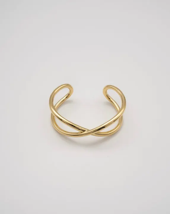 "Cross"series メタルラインをクロスさせて立体感のあるシルエットに仕立てたバングル。 程よい太さのラインが立体的に交差する奥行きあるデザインです。 スタイリングのアクセントに。 存在感がありながらも抜け感を演出します。