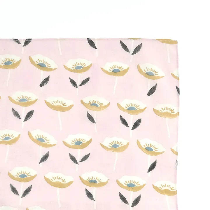 冬に色鮮やかに花開くアネモネをモチーフにしたブロックプリントハンカチ。ギリシャ語で「風」を意味するアネモスを由来に持ち、イギリスでは「wind flower」と呼ばれるこの花が、風に揺れながら咲く美しい姿をデザインに落とし込みました。「希望」や「期待」といった花言葉を持つアネモネは、贈り物としても最適。ハンカチとしてはもちろん、ラッピングやインテリアとしてもお楽しみいただけます。 ブロックプリントとは、木彫り版でハンコを押すように1柄ずつ1色ずつプリントされたものです。まず、アウトラインとなる柄のスタンプを押していき、その後色を乗せていきます。使われている色の数だけ作業は複雑になっていきます。全て手作業の為、染ムラやスタンプの境目などが少し出ていますが、それがブロックプリントの良さでもあり、風合いとなっております。