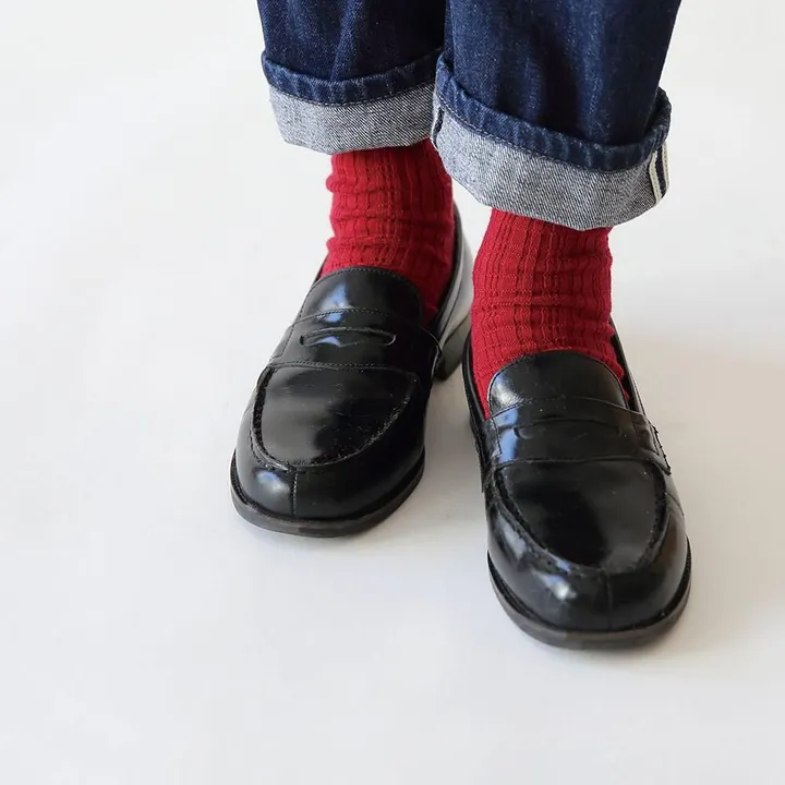 細番手のWOOL糸で編み上げたチェック柄模様の靴下。 コーディネートに柄を取り入れるのが抵抗ある方でも、これなら気軽にトラッドをお楽しみいただけます。 生産地:奈良県葛城市 サイズ:レディースフリー(22.5~24.5cm) 素材:ウール、ポリエステル、ポリウレタン