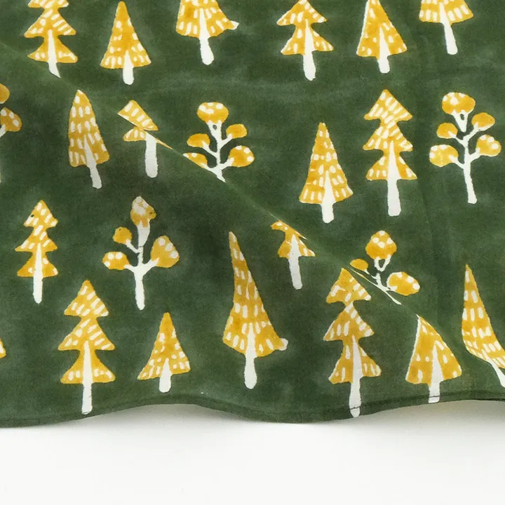 見ているだけでほっこりと心癒される木のモチーフは北欧の豊かな森をイメージしたもの。 木彫りの粗野な風合いと柄がマッチした素朴な仕上がりが魅力です。 55×55cmのバンダナサイズで、ハンカチだけでなくお弁当包みやギフトのラッピング素材としてもお楽しみいただけます。 ブロックプリントとは、木彫り版でハンコを押すように1柄ずつ1色ずつプリントされたものです。まず、アウトラインとなる柄のスタンプを押していき、その後色を乗せていきます。使われている色の数だけ作業は複雑になっていきます。全て手作業の為、染ムラやスタンプの境目などが少し出ていますが、それがブロックプリントの良さでもあり、風合いとなっております。 インドで生産しているファブリックは、手作業で裁断・縫製しているため、同じ商品でも大きさに多少のバラつきがあり、裁断する場所によって柄のズレが生じます。また商品によっては風合いを重視した生地を使用するため多少の織り傷、毛玉がある場合もあります。プリントものは熟練した職人がスクリーンや木版を使用し手刷りで仕上げているため、その時の天候や気温、湿度、また生地の状態によって色のブレが生じたり、色ムラ・かすれ等も見られる場合がありますが、手刷りならではの味わい深い風合いのひとつです。長くご使用いただくために、お洗濯の際は手洗いでお願いします。また、乾燥機による乾燥は布地の傷みや縮みにつながるためお避けください。