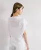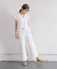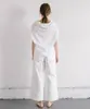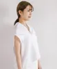 シンプルで着心地の良いホワイトのトップス。カジュアルにもフォーマルにも合わせやすい万能アイテムです。 夏にこの一枚。 インナーの上に一枚で着ても、シャツやワンピースと重ねて着ても涼し気。  さらりとした生地感が心地よく、ゆるいデザインのトップスはあるがままの動きが魅力です。 シルケット加工 UV加工 一枚仕立て 前中心はV字に深く空いています お肌に優しい天竺カットソー