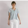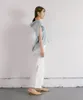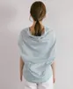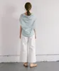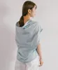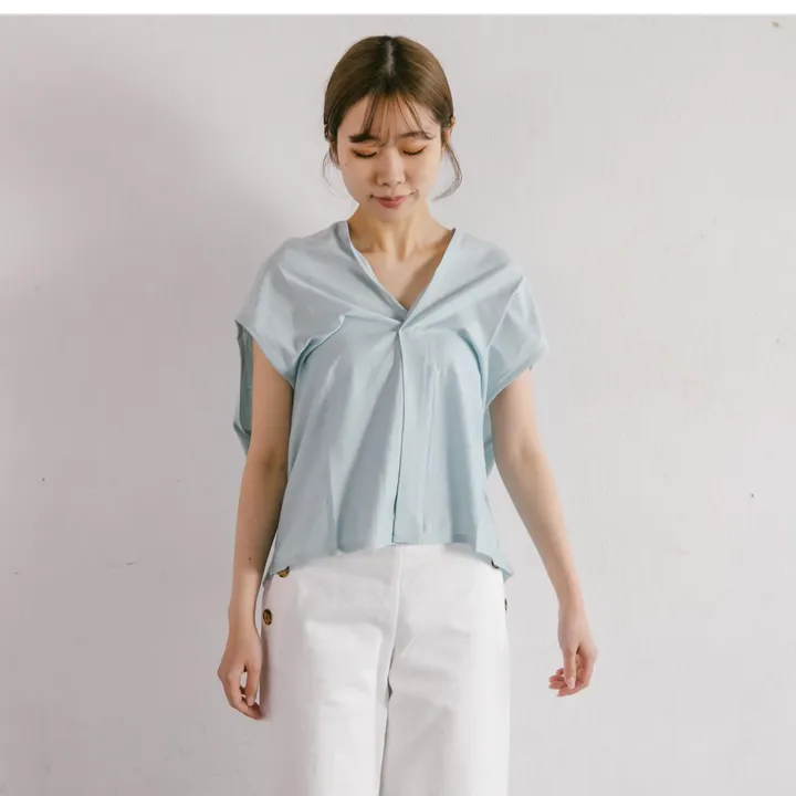 シンプルで着心地の良いストーンブルーのトップス。カジュアルにもフォーマルにも合わせやすい万能アイテムです。 夏にこの一枚。 インナーの上に一枚で着ても、シャツやワンピースと重ねて着ても涼し気。  さらりとした生地感が心地よく、ゆるいデザインのトップスはあるがままの動きが魅力です。 シルケット加工 UV加工 一枚仕立て 前中心はV字に深く空いています お肌に優しい天竺カットソー