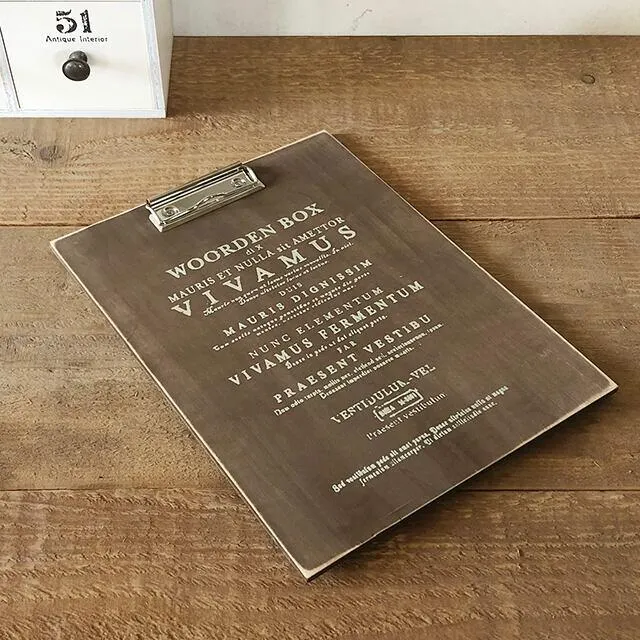 北海道 旭川市の自社工場で製作しています アンティーク仕上げの木製クリップボード ひとつひとつアンティーク加工をしているので 擦れ具合などはどれも違います。 A4サイズのコピー紙をはさむと 4辺まわりに12mmくらいの余白が出る大きさです。 ■商品サイズ --多少の誤差が出る場合があります-- ボードのサイズ  約 横幅238×高さ325×厚み5mm           (金具を含むと厚みは16mm) ■材質 合板
