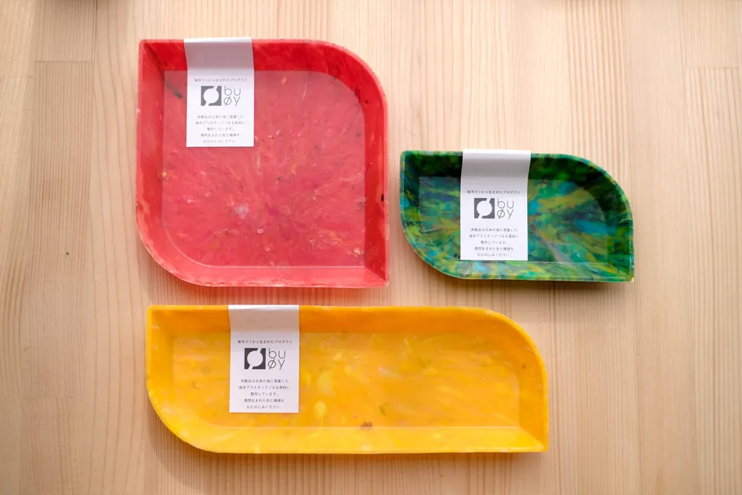 海洋プラスチックごみのアップサイクルブランド「buøy(ブイ)」では、偶然漂着したプラスチックごみを材料に唯一無二の模様と色が魅力の製品を多数展開してます。