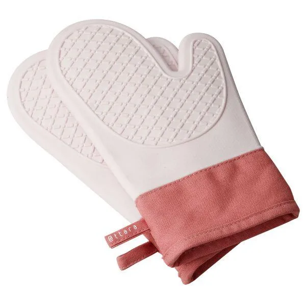シリコン製で汚れが付きにくいオーブンミトン。 女性の手にもフィットしやすいよう、 一回り小さく作りました! 最高耐熱温度はなんと約300℃。 オーブンやグリルなどから食品を取り出すときも 火傷からあなたの手を守ります。 裏地はキルティング加工を施し、 中綿があるおかげで適度なクッション性も◎ お手入れも簡単。 サッと水で流すだけで汚れが落ちます。 裏表共に同じデザインだから、 左右どちらの手でも使用していただけます♪