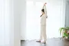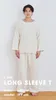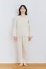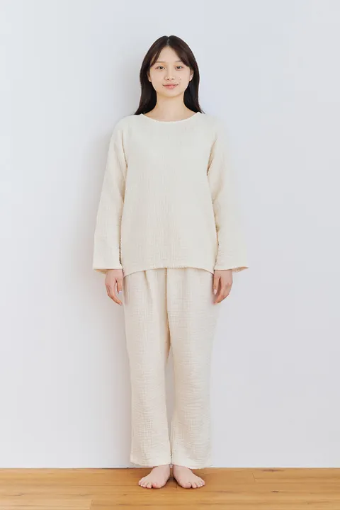 先行して展開していたルームパンツをご愛用の方々をはじめ、たくさんのご要望をいただいておりましたトップスが、ようやく発売となりました。 ふわふわの肌触りが地肌に気持ちよく、サラッとした着心地でありながら、3重織りのガーゼがしっかり保温してくれるので、その軽さ、薄さからすると意外なほどあたたかさがあります。春、秋冬と幅広いシーズンに活躍してくれます。 身幅と、袖丈、アームホールがやや大きめのつくりで、ざっくりとしたシルエットのデザインなので、体のラインを拾いません。 また、ネックホールは着脱時のストレスがない、ややゆったりめの仕様ですが、かがんだ姿勢でも開きすぎないつくりです。 全工程日本製、ホルマリン検査済みで、敏感肌の方でも安心してお使いいただけます。 パジャマ、部屋着などルームウェアとして、そして、ちょっとそこまでお出かけするワンマイルウェアとして、くらしの中のいろんな場面で活躍してくれます。 部屋干しでも乾きやすいので、それほどたくさんの洗い替えも必要ありません。 いつもどおりのお洗濯方法で遠慮なく洗えます。 シワも気になりづらい生地なので、ぜひ気兼ねなくいろんなシーンでお使いください。 サイズはS、M、L、XLがあります。男女兼用となっています。身長やお好みのサイズ感に合わせてお選びください。